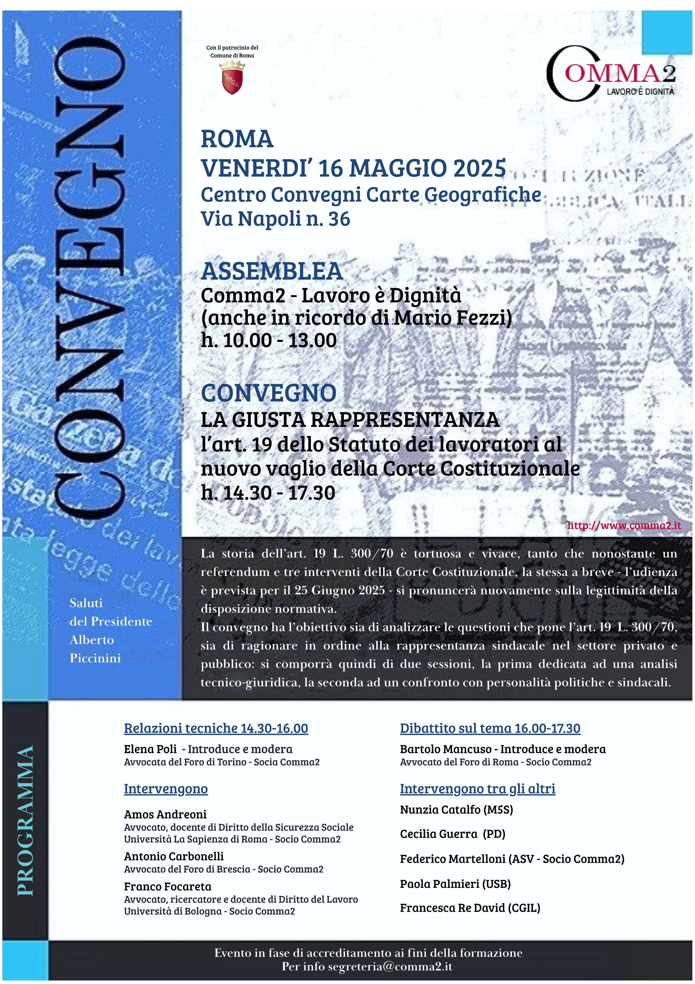 Venerdì 16 maggio 2025, a seguito dell’Assemblea dell’Associazione Comma2 – Lavoro è Dignità, si terrà il convegno “La giusta rappresentanza: l’art. 19 dello Statuto dei lavoratori al nuovo vaglio della Corte costituzionale”, in vista dell’udienza della Corte costituzionale del 25 giugno 2025.